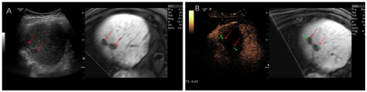 肝脏超声造影与增强MRI检查:S5、S8肿瘤呈"快进快退"表现,提示肿瘤复发。