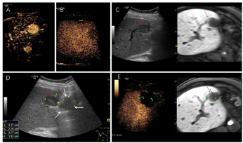 有肝炎病史。肿瘤标志物:甲胎蛋白(AFP)12.15 ng/ml,异常凝血酶原(DCP) 2.96 ng/mL,糖类抗原199(CA199) 8.32 U/ml。超声造影、MR(普美显)检查发现肝内病灶符合"快进快退"表现,经过MDT讨论,考虑肝癌复发。