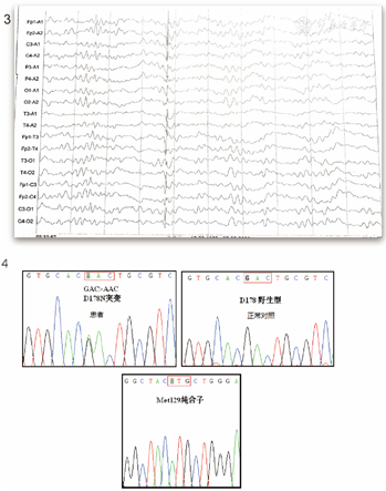 胸部CT示肺部感染,全腹CT未见明显异常。头MRI+DWI+增强+MRA:双侧额叶及侧脑室后角点状缺血灶,DWI未见弥散受限,脑萎缩,增强未见明显强化,颅内血管未见狭窄(图1)。18F-FDG-PET示全脑代谢减低,以双侧额叶、颞叶为著(图2)。视频脑电图示未见典型睡眠生理性纺锤、顶尖波及K复合波,双侧半球散在棘波、尖波(图3)。PRNP基因检测示:PRNP基因存在D178N突变,并与129Met连锁,129基因为Met纯合子(图4)。