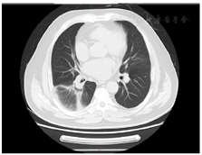患者男,62岁,因"咳嗽喘憋伴智力减退半个月余"之主诉于2019-08-06入院,患者曾于半个月前受凉后出现喘憋和咳嗽咳白色泡沫痰,喘憋持续不能平卧,同时伴有智力和认知能力减退。8月2日于当地医院行胸部CT结果报右下肺大片实变影,诊断肺部感染,给左氧氟沙星和头孢吡肟治疗3天后效果不佳。