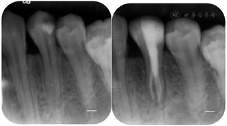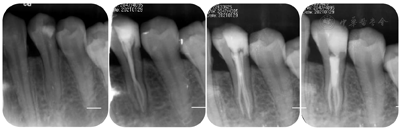 鉴别诊断:⑴慢性根尖周炎[6]:口内检查牙龈无窦道口,影像学检查(X线片和CBCT)示:根尖周未见明显病变,以此与慢性根尖周炎进行鉴别。⑵[9]伴发牛牙症的综合征,如毛发骨综合征和成骨不全症等,除牛牙症,其主要鉴别点是综合征的体征,如毛发骨综合征以头发卷曲、釉质发育不良和骨皮质增厚为主要特征[10,11]。早期牙本质发育不全:髓室高大,但牙冠呈琥珀色,呈半透明,牙颈部缩窄明显,牙冠呈球根状;髓腔壁薄。发育期的磨牙:髓室高大,但髓腔壁薄,根尖孔大,呈喇叭状,牙根未发育完全,发育完成后髓腔形态正常。患者现22岁,下颌第一前磨牙完全萌出,发育为成熟的恒牙,以此可与早起牙本质发育不全和发育期磨牙进行鉴别。在临床检查中未见患者头发卷曲,全口牙齿未见明显的釉质发育不全,所以可与伴发牛牙症的综合征进行鉴别。