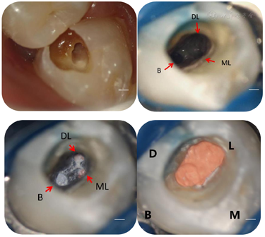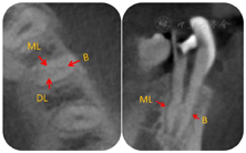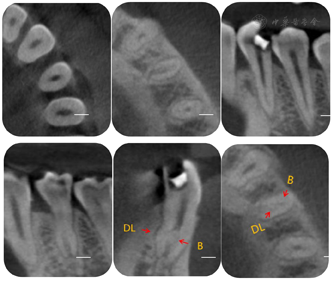 治疗过程:34去除暂封材料及棉球,洞壁见大量腐质,颊侧及舌侧的髓室顶未完全揭除(见图7A);去净腐质,玻璃离子制作假壁,上橡皮障,揭净髓室顶,显微镜下见髓腔狭窄,髓室底深。依据术前CBCT测量数据:髓室底距颊尖:14.0mm,髓室底距釉质牙本质界CEJ:6.5mm,在显微镜下,使用超声ET20去除牙本质领,修整、扩大髓室壁,建立直线通路。见髓室底有钙化物,同时去除髓室底钙化物,充分暴露髓室底,DG16仅探及颊侧通路,C+疏通,扩大至15#。在CBCT上对远舌通路进行定位,远舌通路位于颊侧通路远中舌侧约2.0mm(见图3F),显微镜下,ET25逐层去除根管口牙本质领,充分暴露远舌通路根管口,根管弯曲细小,伴有弥漫性钙化,依次使用6#、8#、10# C锉,尖端2mm预弯,结合EDTA凝胶逐号疏通根管,1%NaClO大量冲洗,回挫,电测根管长度:B=21.0mm,DL=19.0mm,镍钛预备根管,B:25# 6%,DL:25# 4%。试主尖,根尖片发现根管有遗漏(见图2B)。再次结合CBCT对近舌通路进行定位CBCT颊舌观:近舌牙根弯曲,根管影像不清(见图6B);横断面:近舌通路根管口位于颊侧通路远中舌侧1.5mm,远舌通路近中颊侧约1.0mm,近舌通路根管口牙本质领较厚(见图6A),显微镜下,ET25少量缓慢逐层去除1~2mm钙化物及牙本质领,小号锉反复探查,探及近舌通路根管口;疏通方法同远舌通路,电测根管长度:ML=19.0mm,EDDY尖结合1%NaClO声波活化荡洗,试主尖,X线片示:到达工作长度(见图2C),根管内封入Ca (OH )2糊剂,玻璃离子暂封。2周后复诊,患牙未诉不适,iRoot sp单尖充填3通路,髓腔热牙胶回填,完成根管治疗。术后拍摄X线片显示,根管充填恰填(见图2D)。
