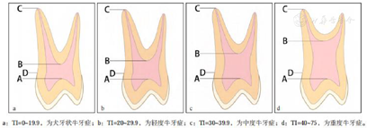 诊断标准:⑴慢性牙髓炎诊断要点[6]:可以定位患牙的长期冷、热刺激痛病史和(或)自发痛史;肯定可查到引起牙髓炎的牙体硬组织疾病或其他病因;患牙对温度测验的异常表现;叩诊反应可作为很重要的参考指标。⑵Keene[7]提出"牛牙症指数(taurodontic index,TI)",TI=(AB/AC)×100,将其分为犬牙状(0~19.9)、轻度(20.0~29.9)、中度(30.0~ 39.9)和重度(40.0~75.0)4种类型(见图4)。⑶Fan等[8]使用显微CT对下颌第一前磨牙C形根进行了连续的横断面研究,并对C形根管进行分类(见表1)。