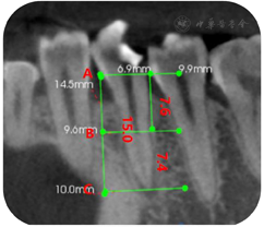 诊断证据:⑴根据主诉和现病史中疼痛性质和特点,临床检查中牙髓活力测试:无反应,影像学检查(X线片和CBCT)示:根尖周未见明显病变,诊断34慢性牙髓炎。⑵左下颌第一前磨牙CBCT近远中向TI测量,AB:15mm、AC:7.6mm,AB / AC x100%= 50.7%诊断为重度牛牙症(见图5)。⑶CBCT横断面示:34牙根中下1/3牙根横截面呈C形(见图3B),诊断为34 C形根管。