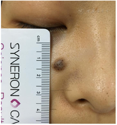 患者青年女性,自幼发现右侧面部黑色皮肤肿物,肿物缓慢生长,无自发破溃、疼痛,表面少量毛发生长。
