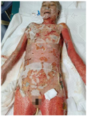 患者女,22岁,2021年2月3日不慎被汽油火焰烧伤头面颈躯干臀部四肢等全身多处,先后在外院行3次植皮手术治疗,于3月27日(伤后52d)入住我科。
