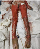 先后在外院行3次植皮手术治疗,于3月27日(伤后52d)入住我科。患者住院治疗200d,总共进行11次临床植皮手术,进行康复治疗186d。