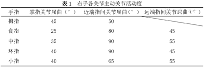 | 手指 | 掌指关节屈曲(°) | 近端指间关节屈曲(°) | 远端指间关节屈曲(°) |