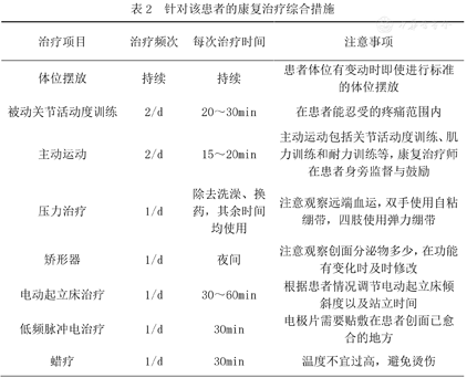 国内烧伤学科专家制定了《烧伤康复治疗指南(2013版)》[3]。该指南指出,到目前为止尚无任何方法可以从根本上阻断瘢痕的增生,体位摆放、支具的应用、牵伸治疗和运动疗法都是瘢痕综合治疗中不可替代的治疗手段。因患者大部分创面未愈合,则从体位摆放、被动关节活动度训练、主动运动训练开始。随着患者创面愈合,配合度的提高,依从性越来越好,逐渐加强康复治疗强度,采取系统的联合治疗措施。包括:体位摆放、被动关节活动度训练、主动运动训练、压力治疗、矫形器、电动起立床治疗、低频脉冲电治疗、蜡疗。具体治疗措施实施如表2.