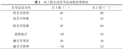 | 关节活动方向 | 左上肢(°) | 右上肢(°) |