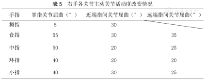 患者从入院至今,残余创面基本愈合,各关节主动关节活动度不同程度增加,具体如表3、表4、表5.患者通过综合的治疗达到辅助下步行、自行进食等。