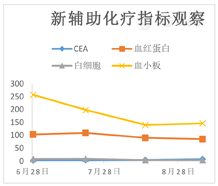 此病例在新辅助化疗前诊断(腺癌cT4bN+M0),根据中国抗癌协会胃癌专业委员会发布的《局部进展期胃癌围手术期治疗中国专家共识》(2021版)[1]推荐新辅助化疗或联合放疗,4程新辅助治疗后复查等待肿瘤降期或退缩后抓住时间窗再行根治手术治疗。首次住院完善检查评估经过MDT讨论后考虑肿瘤分型为BorrmannⅢ型,需先行新辅助化疗,但患者有幽门梗阻症状,决定先行腹腔镜探查及全腔镜下胃空肠吻合改流手术,同时也是遵循对于BorrmannⅢ型、大于8 cm的肿瘤建议行腹腔镜探查了解腹膜、网膜、系膜是否存在转移,获得腹腔镜探查肿瘤分期及可切除性评估,探查证实肿瘤位于胃窦部环周,6 cm×8 cm大小,侵出浆膜,侵犯胆囊、横结肠、十二指肠韧带、胰头和横结肠系膜,灶区旁多发淋巴结肿大,肝、脾、腹膜未见转移及种植癌结节。初步判断为不可切除局部进展期胃癌,术后给予SOX方案行新辅助化疗[2],经过三程新辅助化疗后复查胃镜前后对比,内镜下发现肿瘤完全退缩,活检病理同样支持病理完全退缩(图1、图2),复查全腹部CT+增强扫描可以了解原灶区明显降期,胃窦部胃壁稍增厚,与胆囊、横结肠、胰腺的界限清晰,灶区周围未见明显肿大淋巴结(图3),从影像学角度分析肿瘤退缩明显,转化至可切除范畴。指南推荐术前新辅助化疗4程到6程后评估效果,此病例在术前新辅助化疗3程后全面评估后无论从影像学及内镜检查还是病理学上均获得良好退缩改变,在术前新辅助化疗期间注意观察患者血红蛋白、白细胞、血小板及癌胚抗原,随着化疗的进行患者还是出现了轻度骨髓抑制,白细胞、血红蛋白均有不同程度的下降[3],血小板仍在正常范围内,暂不制约新辅助化疗的进行,但随访癌胚抗原的结果在第1次、第2次新辅助化疗时虽较前均有升高,但仍在正常范围内,且升高幅度均低于30%,而第3次化疗时复查癌胚抗原高于正常值,且升高幅度大于60%(图4),在影像学、内镜及病理检查均获得完全退缩情况下[4],CEA反而升高,此时我们认为新辅助化疗的再评估时间不是机械的固定在4~6个疗程,需综合参考血红蛋白、白细胞、血小板变化情况,特别需要关注CEA的变化情况[5],在新辅助化疗可能出现耐药或者可能出现复发转移的时间窗口及时评估肿瘤退缩评分,及时评估肿瘤的可切除或不可切除性,积极引入外科手术干预,不至于错过最好的手术时机[6]。