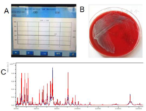 注:A脑脊液血培养瓶增菌后血培养仪报警曲线,B脑脊液增菌后转种血平板培养24小时,C患者1(蓝色),患者2(红色)脑脊液增菌后质谱鉴定为羊布鲁氏菌