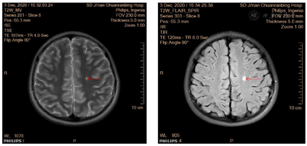 影像学检查:2例患者均行磁共振成像(MRI)检查,MRI示双侧半卵圆中心见小片状长T1长T2异常信号,FLAIR呈高信号(图B箭头),DWI呈高信号,ADC图低信号(图2)。
