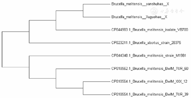 对分离到的2株菌株进行基因组序列比对。经数据过滤和组装后,获得部分基因组序列。将其与公共数据库下载国内外流行株比较,构建系统进化树(图3),证实2株布鲁氏菌与2019年印度Veeraraghavan B等已报道的CP044983.1株羊布鲁氏菌在进化系统中亲缘性最为相近[11]。