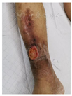 患者入院时右下肢患处皮肤色素沉着及破溃流脓。