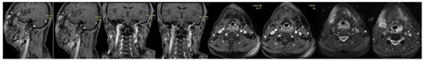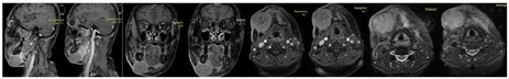 辅助检查:MRI提示右侧颌下软组织肿胀,渗出,邻近皮肤增厚,双侧颈部IB区多发小淋巴结,较大者为右侧,短径41 mm(图1)。病理提示颌下软组织非角化性未分化癌,免疫组织化学(Immunohistochemistry,IHC):P63(+),CK5/6(+), EGFR(+),S-100(个别细胞+),SOX10(-),P53(70%+), Ki-67(80%+)。EBV-EBER部分+。Epstein-Barr病毒(EB virus, EBV)脱氧核糖核酸(deoxyribonucleic acid, DNA) 7.58×103 copies/ml。