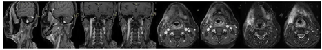 患者,女性,52岁。因"鼻塞流涕1个月"于2015年12月在外院诊断为鼻咽未分化型非角化性癌并左侧咽后左上颈部淋巴结转移T4N1M0 IVA期,2015年12月至2016年1月行多西他赛+奈达铂(TP方案)化疗3周期,2016年2月至2016年4月行同步放化疗,PGTVp 70Gv/32次, PGTVn 70Cy/32次,顺铂同期化疗,治疗后肿瘤缓解,定期随访。2019年6月复查提示鼻咽癌复发,分期为rT4N0M0。2019年7月行复发灶放疗54Gy/27次,不定期随访。2021年3月患者出现右侧颌面部肿物,进行性增大,局部出现红肿热痛,于2021年5月就诊于本科。既往健康,无家族史。出生长期居住于海南本地。