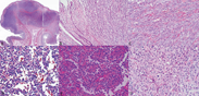 镜下:低倍镜下肿瘤主要位于黏膜下,呈浸润性生长,侵及肠壁全层,达浆膜外脂肪组织;瘤细胞呈弥漫片状、巢状或条索状,有纤维分隔;部分区域出现裂隙样腔隙,呈假乳头状结构;高倍镜下,瘤细胞较一致,中等大小,卵圆形或者短梭形,核仁较明显,居中,胞质丰富、嗜酸性、未见黑色素。肠周淋巴结未见转移(病例103图1)。
