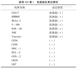 (1)胃肠道间质瘤(GIST):通常同时表达CD117、DOG-1、CD34三项标志物,或者至少两项指标强阳性,三项标志物中该病例仅表达CD117,且同时表达黑色素标志物,不支持GIST。