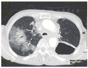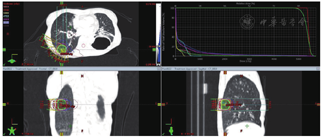 患者拒绝行CT引导下肺穿刺,未行化疗联合靶向治疗,于2016年6月行右肺转移灶精确放疗,仰卧位,负压袋固定体位,激光灯摆位,CT扫描,TPS优化放疗计划,IMRT技术,给予右肺转移灶精确放疗,5.0Gy/次,计划10次,总剂量50Gy。危及器官受量:脊髓最大受量4347cGy,心脏平均受量157cGy,右肺平均受量2622cGy,左肺平均受量474cGy,双肺平均受量289cGy,V20=5%(病例22图3)。放疗结束后胸部CT扫描示病变体积明显缩小,近期疗效PR优。放疗结束1个月,再次发现右肺新发转移,并再次给予大分割放疗(50Gy/10次,病例22图4),3个月后病情基本稳定,出现发热、咳嗽、胸闷、憋气,并逐渐加重,CT诊断为急性放射性肺炎(病例22图5),给予甲强龙,氧气吸入,抗感染,雾化等治疗好转后出院,失访。