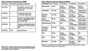 2.应用SABR或SBRT,需要注意肿瘤和器官的移动,尤其是呼吸运动,在模拟定位时建议进行呼吸运动管理,如主动呼吸控制(ABC),腹部压迫法浅呼吸,周期性呼吸门控,肿瘤动态跟踪。建议4D-CT,慢速CT扫描获取内靶区,减少靶区外放范围。当使用复杂的运动管理技术时,推荐影像引导放射治疗技术(IGRT)。