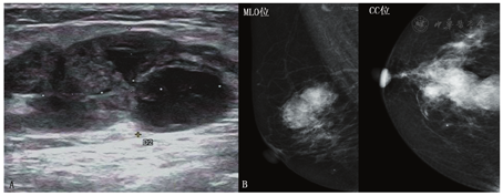 注:B超示右侧乳内低回声肿块,边界欠清(A);钼靶示右侧乳腺内团块状高密度影,边缘毛糙(B)