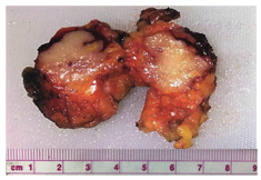 大体:肿物边界欠清,大小2.5cm×2.5cm×2cm,切面灰白质脆,部分区域呈胶冻状,有光泽(病例19图2)。
