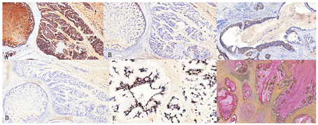 注:A: CK7; B: CK20; C: GATA-3; D: P63; E: Ki67; F:黏液卡红。肿瘤细胞CK7阳性,CK20阴性,GATA-3阳性。大部分囊壁周围肌上皮细胞P63阴性。肿瘤细胞Ki67指数较高(约60%),包括细胞形态温和的区域。特殊染色示肿瘤细胞内外黏液呈黏液卡红染色阳性