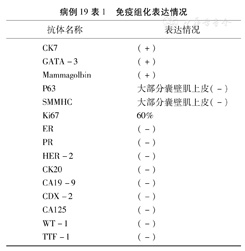 免疫组化:肿瘤细胞CK7、GATA-3、Mammaglobin阳性。ER、PR、HER-2阴性。囊壁肿瘤细胞外侧肌上皮细胞P63及SMMHC示少部分囊壁为阳性,大部分囊壁为阴性。Ki67指数约60%,包括细胞形态温和的区域,Ki67指数亦较高。其余抗体阴性(病例19图4,病例19表1)。