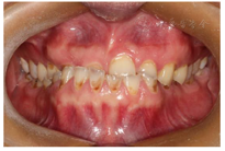 下颌前突伴上下颌牙中线偏斜;前牙反颌;上颌牙列缺损;牙过度磨耗;釉质发育不全;44牙牙体缺损。