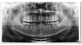 曲面体层片示双侧下颌骨未见明显不对称,牙槽骨未见明显吸收;44牙