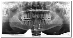 影像学检查:曲面断层片及CBCT示,上下颌骨可见多个钛板内固定,12、24、34、44牙缺失。余骨质未见确切异常改变(图12,图13)。