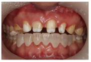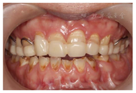 建议患者:(1)行正颌手术,上下颌骨前份根尖下截骨术,拔除24、34、44牙,改善颌间关系及下颌前突,提供修复空间;(2)前牙行牙周手术,使龈边缘协调对称;(3)上述治疗后,前牙固定修复,恢复牙体形态和功能。
