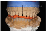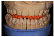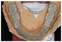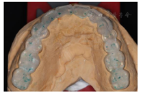 架,取正中关系,制作全口诊断蜡型、硅橡胶成型阴模,技工室依据诊断蜡型翻制上下颌透明