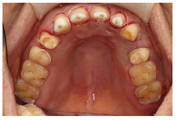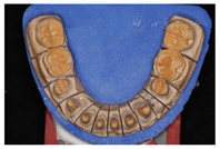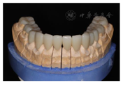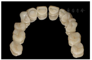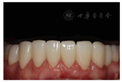 在临床研究中,抛光后的氧化锆或抛光和上釉的氧化锆与长石质和玻璃或硅酸锂陶瓷相比,对牙釉质产生相似或者更低的磨损[3]。为了避免因前后牙修复材料不同,造成修复体磨损速度不一致,本病例所有修复体均采用整体超透氧化锆制成的,并且进行了精细抛光,这到底有多大的意义,根据目前的数据尚不能进行结论性的判断。由于其他陶瓷可能造成更大的磨损,使用整体氧化锆材料是合理的。