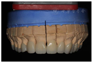 首先对上颌牙进行牙体预备,将诊断蜡型的硅橡胶成型阴模切片,指导前牙预备。牙体预备完成后,制取硅橡胶印模,灌制工作模型。于备牙过程中逐步去除