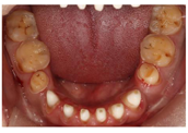 12、24、34、44牙缺失,12牙缺失牙间隙无,13牙与11牙建立邻接,24、34、44牙缺失牙间隙减少。咬合检查:上颌牙中线与面中线一致,下切牙中线右偏约1.5mm,11、13牙对刃,前牙部分开