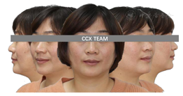 (1)行正颌手术,上下颌骨前份根尖下截骨术,正颌手术后四个月:面部外貌得到明显改善,面部中线与牙齿中线一致,面下1/3高度适中,后牙