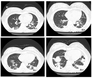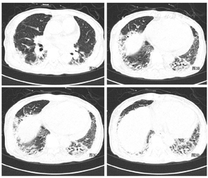 实验室检查:血气分析(FiO2:37%)pH 7.464 ,PaO2:87.4 mmHg (氧合指数:236),血常规:白细胞2.40×109/L,中性粒细胞占:50.5%;淋巴细胞占:23.8%。血红蛋白98 g/L,血小板180×109/L;血沉:81mm/h;血清铁蛋白:1964ng/mL,抗核抗体1:100,胞浆颗粒型,肌炎谱:抗MDA5-IgG(++)、抗Ro52-IgG (+++);胸部HRCT示:双下肺分布实变影,伴有肺容积缩小(图3)。