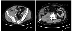 甲泼尼龙500mg×3天,逐渐减量(250mg×3天、160mg×3天、80mg×5天);环磷酰胺0.8gqw×2次;余予以全覆盖抗感染以及吡非尼酮600mg tid /d抗纤维化治疗。患者经过治疗后气促症状好转。患者于9月20日出现右侧大腿及臀部疼痛,未见红肿,皮温不高,无压痛。9月21日出现腹痛,压痛及反跳痛明显。急查血常规:红细胞:2.8*1012/L,血红蛋白:86g/L;凝血功能:PT:14.2秒、APTT:50.1秒、纤维蛋白原1.76g/L。综合上述临床表现,不排除腹腔出血可能性,行床旁B超提示腹膜后混合回声区,不排除脓肿或血肿。为进一步明确诊断,于当日申请急诊腹部CT,提示右侧腹膜后及右侧腹直肌多发血肿,周围脂肪间隙及腹膜增厚(图2)。请介入科会诊后建议介入治疗,因患者一般情况差,家属拒绝进一步治疗自动出院后随访患者死亡。