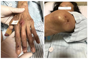 入院体检:T36.5℃ P136次/分R40次/分BP126/78mmHg,指间关节,掌指关节,肘部可见紫红色丘疹,伴破溃结痂(图4)。双下肺闻及Velcro啰音。四肢肌力肌张力正常。余查体无异常。