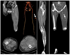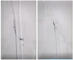 甲泼尼龙500mg×3天,继以逐渐减量(250mg×3天、160mg×3天、80mg×5天);环孢素75mg,bid;环磷酰胺0.8g qw×3次,余予以全覆盖抗感染以及吡非尼酮600mg tid /d抗纤维化治疗。患者于11月21日诉左侧大腿肿痛。血常规:血红蛋白:65g/L;血小板:89×109/L。凝血功能PT14.4秒、APTT42.1秒、纤维蛋白原1.24g/L。不能排除下肢肌间出血可能,急行床边B超:左大腿软组织区包块--血肿?行下肢动脉CT:考虑左侧大腿肌间血肿形成(图5)。介入科会诊后行超选择性左侧股深动脉-穿动脉栓塞术(图6)。患者出血停止,血肿吸收,好转出院。目前仍在随访中。