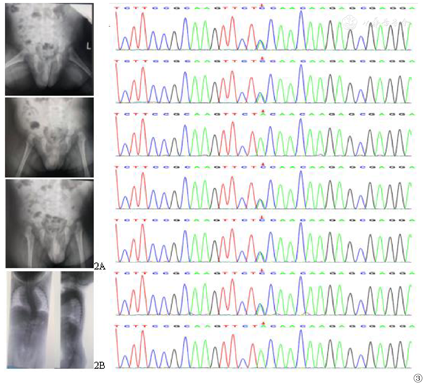 随访先证者:患儿1个月时会吃奶,易呛咳;半岁时体重6kg,不会翻身、不会独坐;1岁,体重9kg,平素呼吸促,易呛奶,竖头不稳,可侧翻身,不会独坐,不会独站,不会走,双足外翻,髋关节脱位,脊柱侧弯明显(图2),面肌及眼球活动正常,脸型无特殊。现2岁2个月,大运动发育迟缓,仍不会独站、不会独走,认知正常。