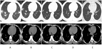 出院后口服阿莫西林克拉维酸钾继续抗感染治疗。1个月后患者门诊复查,自诉无明显特殊不适,体温正常,双肺呼吸音清,复查胸部CT见双肺炎性病灶明显吸收,白细胞、C反应蛋白,降钙素原均正常,血小板恢复正常。2个月后患者症状完全缓解,体温正常,双肺呼吸音清,门诊复查胸部CT未见异常,白细胞、C反应蛋白、降钙素原均正常,血小板恢复正常。患者痊愈。