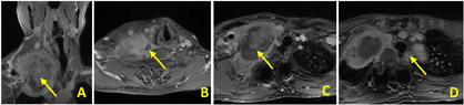 CT及MR增强显示右颈部不均质肿物,包绕右锁骨下动脉并压迫锁骨下静脉及臂丛神经。