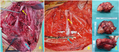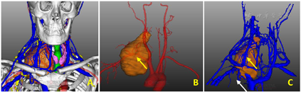影像学检查:CT平扫+增强:右颈部胸锁乳突肌内侧肌间隙内肿瘤性病变,大小约166 mm×85 mm,考虑神经纤维瘤可能;由右锁骨下动脉及右侧椎动脉供血,右颈总动脉、气管及临近结构向左移位。右锁骨下动脉及颈内静脉被肿瘤紧密包绕(图2)。MR平扫+增强显示:肿物与C6-T2右侧椎间孔关系密切,考虑神经纤维瘤可能,右锁骨下动脉及右侧椎动脉供血。我们通过提取术前薄层CT增强数据,通过Mimics V20.0(比利时Materialise公司)软件重建患者肿瘤及邻近组织的三维立体图像,从而更直观观察肿瘤大小、形态以及规划手术切除方案(图3)。