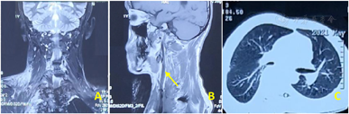 1个月余前发现右颈部痛性肿物。随访期间肿物进行性增大并伴右手内在肌萎缩及肌力下降。