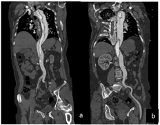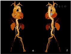 CTA图像显示:主动脉根部至双侧髂总动脉管腔呈双腔样改变(图a~b);两腔密度不一致,假腔大于真腔(图c~d),右侧髂总动脉、髂内外动脉显影明显差;腹腔干受累,显影差(图e~f)。
