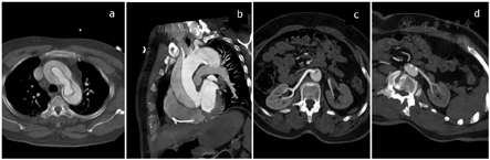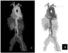 如下轴位图所见:头臂干、左颈总动脉、左锁骨下动脉管腔亦呈双腔样改变(图2a~b)。右肾动脉起自真腔,左肾动脉起自假腔,显影差(图2c~d)。